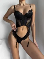 Корсетний бюстгальтер з чашечками на кісточках, стрінги середньої посадки — усе в єдиному стилі, оздоблене фігурним мереживом, та прозорою сіткою.