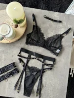 Комплект жіночої білизни – бюстгалтер з прозорою сіткою і мереживом – трусики – чокер – гартери – чорний