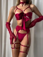 Комплект жіночої білизни – бюстгальтер-бант – трусики – чокер – рукавички – пояс з гартерами – червоний