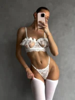 Бра на кісточці з відкритою чашечкою, оздоблений квітковим декором, стрінги, прозора спідничка з шлейками під панчохи, панчохи — усе в єдиному стилі, створене для пристрасного образу.