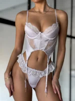 Корсетний бюстгальтер з чашечками на кісточках, стрінги середньої посадки — усе в єдиному стилі, оздоблене фігурним мереживом, та прозорою сіткою.
