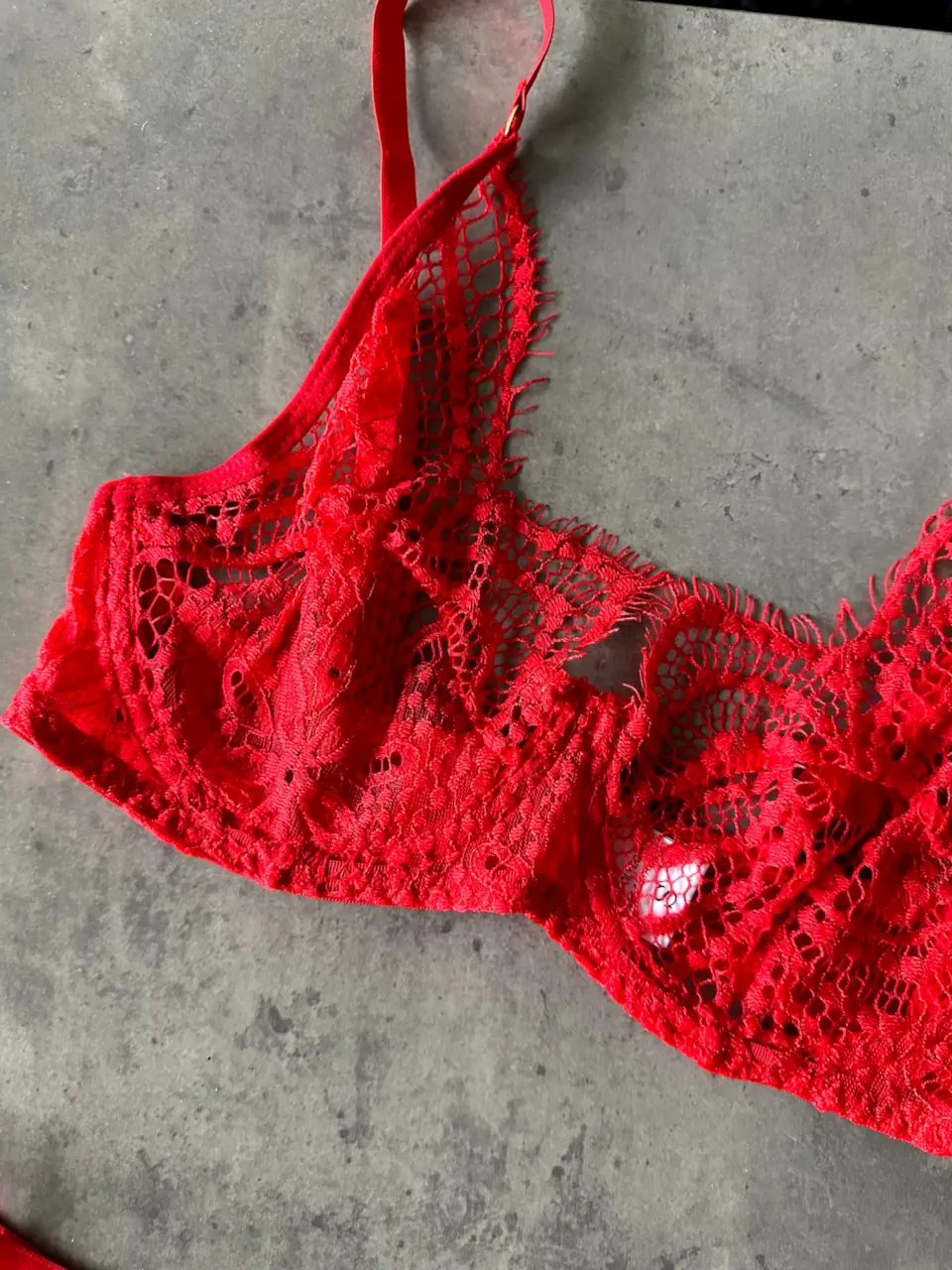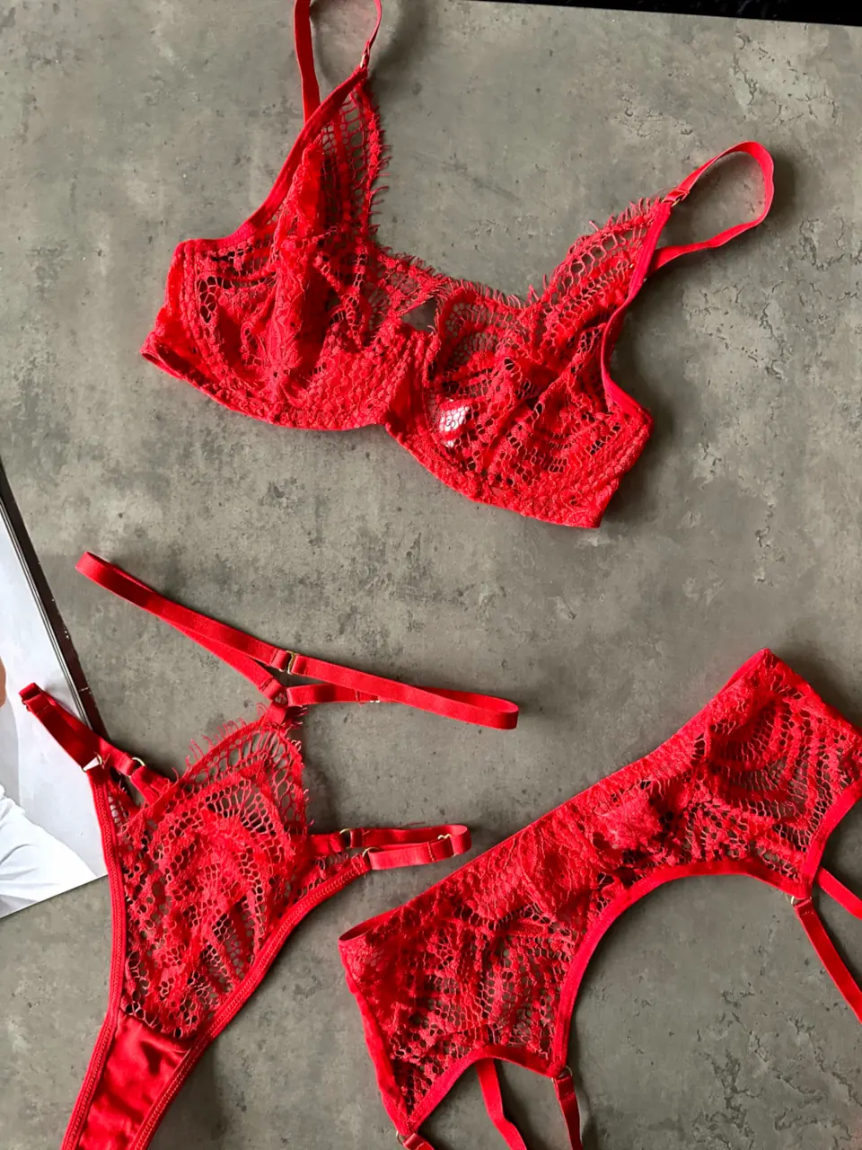 Комплект жіночої білизни – мереживний бюстгальтер – прозорі стрінги – пояс – червоний