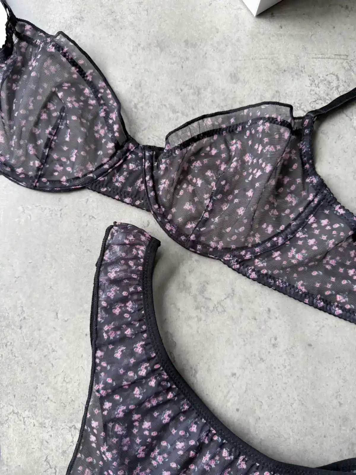 Легкий та жіночний комплект із напівпрозорої чорної сітки з делікатним рожевим квітковим принтом.