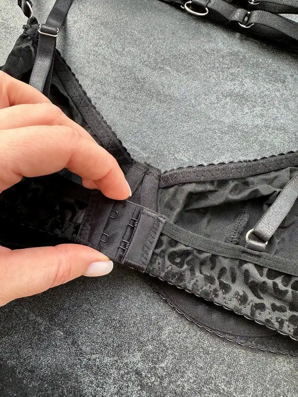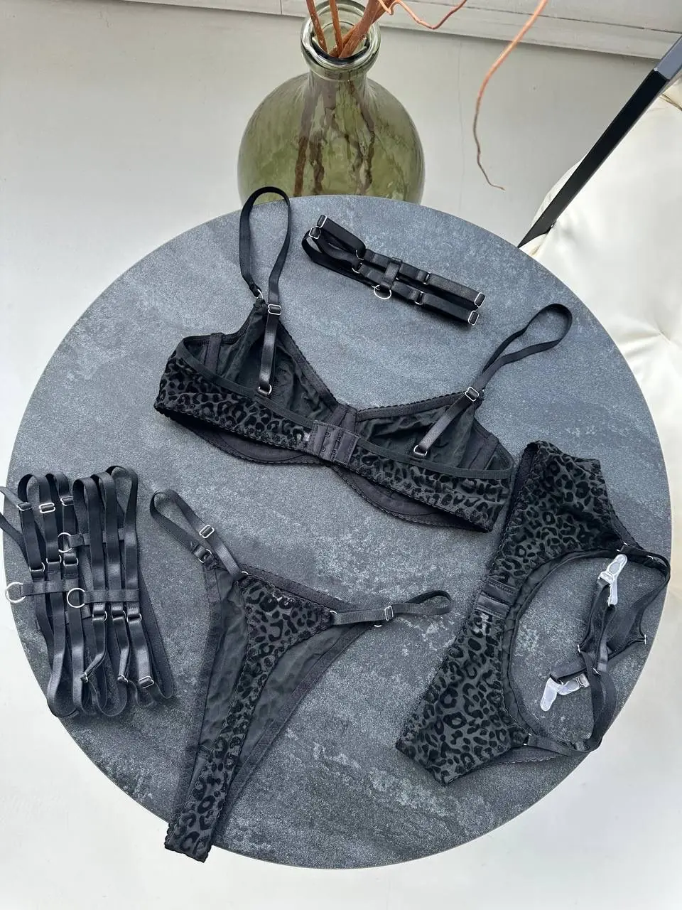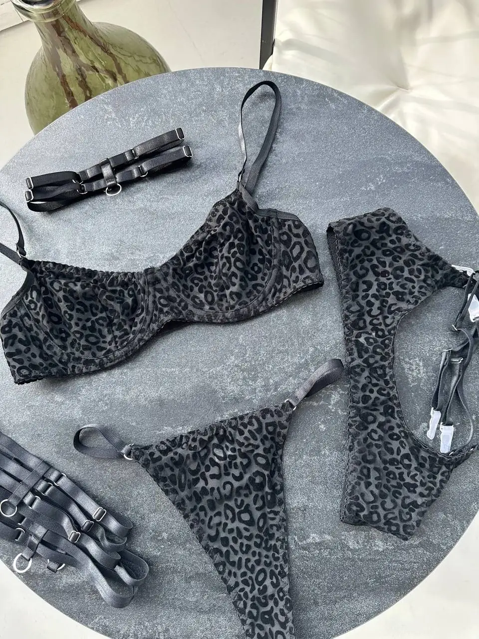 Комплект білизни – прозорий леопардовий бюстгальтер – леопардові стрінги – пояс з гартерами – чорний