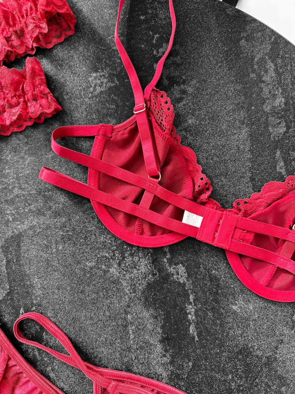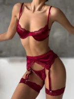 Комплект жіночої білизни – сатиновий бюстгальтер – стрінги – пояс з гартерами – червоний