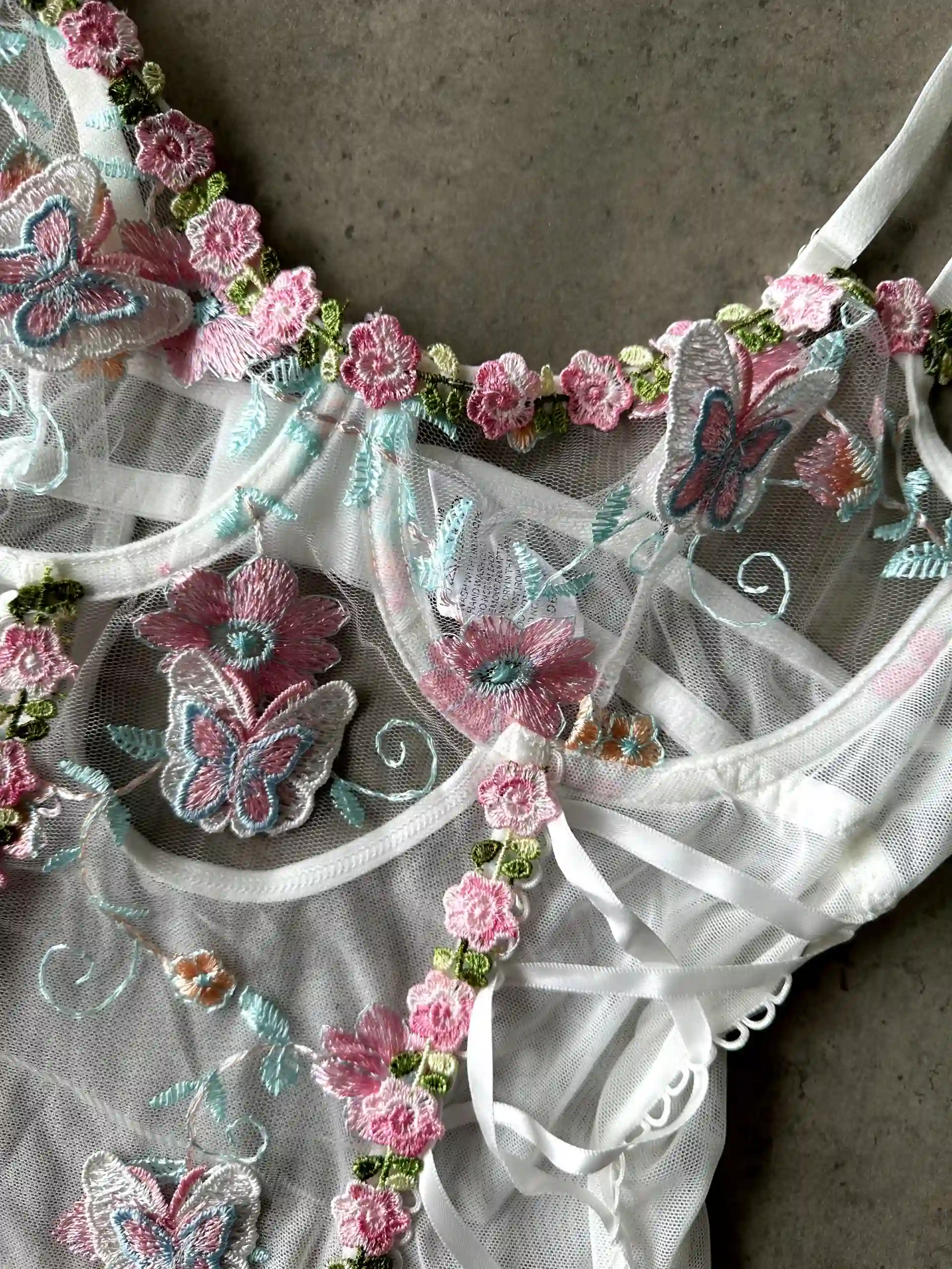 Преміальний комплект з яскравою вишивкою, м’якою чашечкою, декоративним переплітом уздовж талії, трусиками та панчохами. Вид ззаду підкреслює графічність і витонченість силуету.