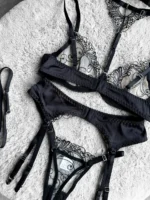 Чашечки з кісточками для підтримки, але виконані з прозорої сітки з вишивкою, декоративний чокер зі з’єднувальною центральною шлейкою, стрінги з мереживною прозорою передньою частиною та тонкими боковими шлейками, пояс із прозорими деталями та регульованими підв’язками для панчіх.