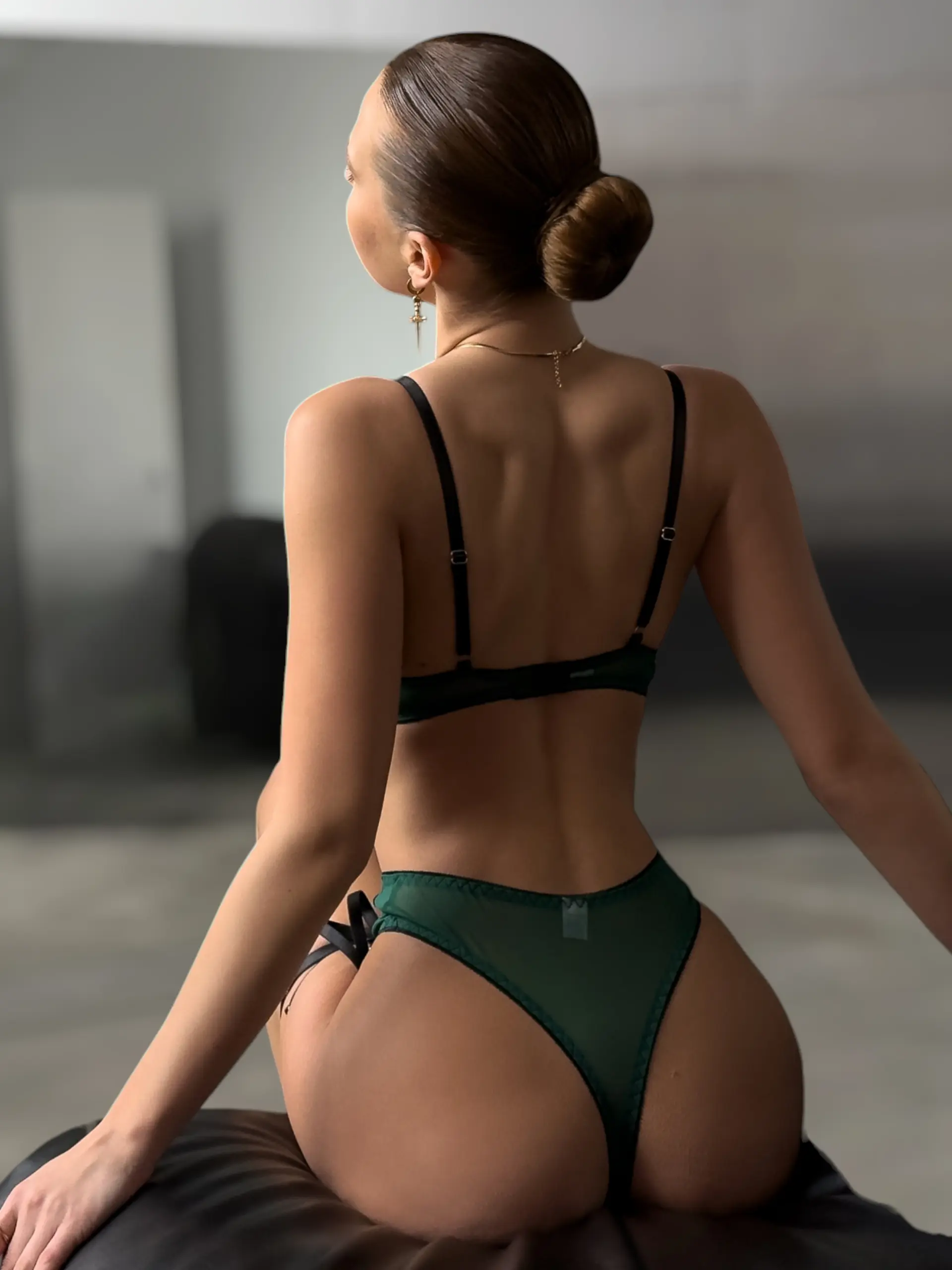 Високі стрінги: спереду — чорне мереживо і сітка, ззаду — напівпрозора зелена сітка. На стегнах — вбудовані підв’язки.